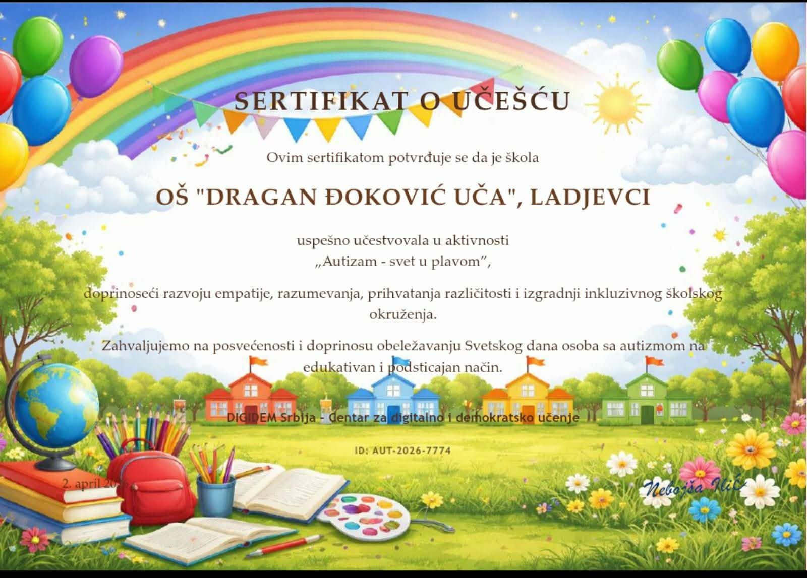Светски дан особа са аутизмом Поводом 2. априла - Светског дана особе са аутизмом, наша школа се придружила активности ДИГИДЕМ Србија. Ученички парламент је заједно са ученицима петог разреда дао свој скромни допринос обележавању Светског дана особа са аутизмом и на тај начин пружио подршку свима који се суочавају са овим проблемом. Послали су им поруке разумевања, емпатије и подршке у облику срца и разнобојних балона у жељи да не одустају, да знају да су саставни и равноправни део овог друштва и да су прихваћени. Сагласни смо да људе треба прихватати онакве какви јесу, без потребе да их мењамо. Реализатор активности , Јелена Танасковић