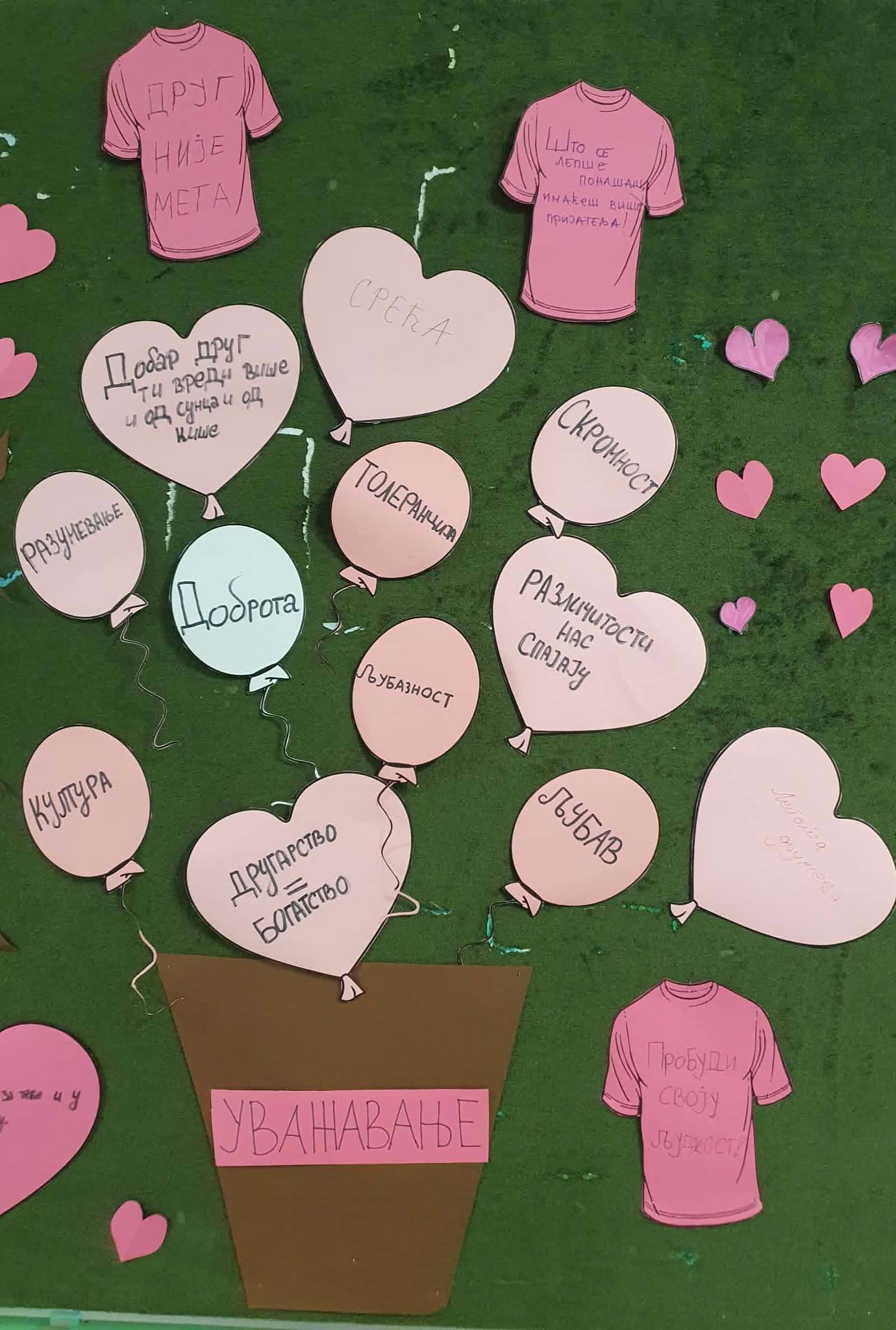 Ученици и предш̣колци овог школског места обележили су Дан ружичастих мајица кроз занимљиву заједничку активност. Ученици су написали своје име на балону и све балоне бацили у ходник. Након тога добили су задатак да пронађу свој балон. И поред силне жеље успело је само неколицини ученика да пронађу свој балон. Дат је следећи задатак , да сви узму први, најближи балон и предају другу коме припада балон. Балон у овој активности је представљао срећу , а циљ активности АКО НАМ ЈЕ СТАЛО ДО ТУЂЕ СРЕЋЕ, НАЋИ ЋЕМО И СВОЈУ. Циљ је остварен у потпуности , јер смо показали да умемо да се обрадујемо и својој и туђој срећи и да је лепо када имаш пријатеље да поделиш срећу