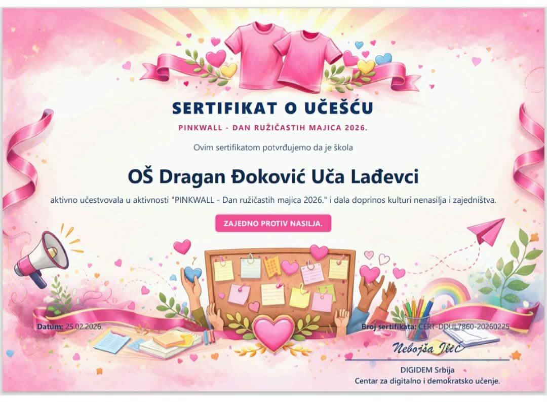 Сертификат о учешћу наше школе у активности "PINKWALL- Дан ружичастих мајица 2026." у организацији Центра за дигитално и демократско учење ДИГИДЕМ Србија
