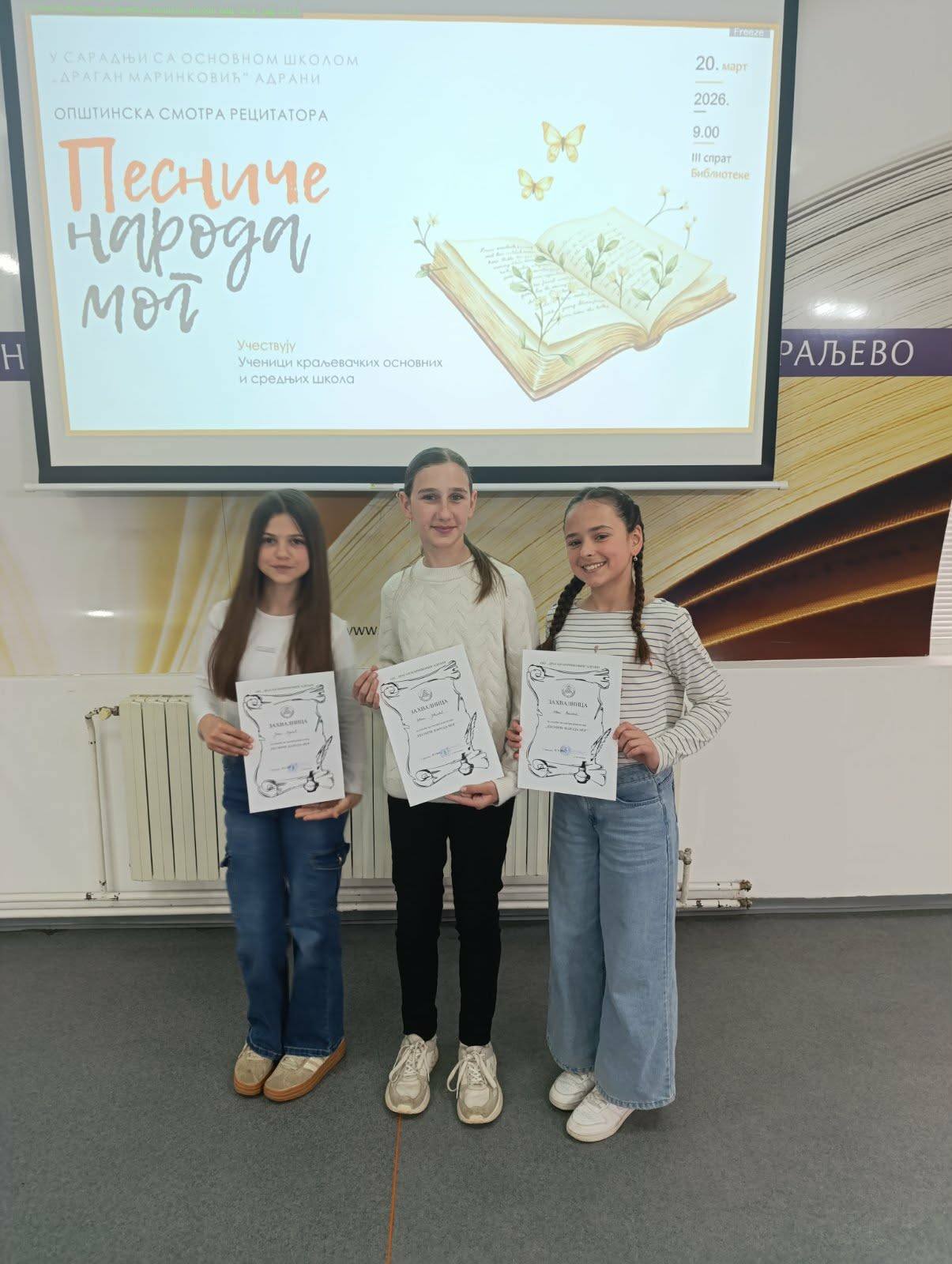 Још једна Смотра рецитатора под називом Песниче народа мога, која је окупила талентоване ученике и љубитеље поезије. Нашу школу су представљали: 1. Ангелина Вучићевић, ментор: Зорица Крунић 2. Андрија Ђорђевић, ментор: Зорица Крунић 3. Ђорђе Сретовић, ментор: Олгица Гочобија 4. Ивона Ратковић, ментор: Жељко Јовановић 5. Јана Којовић, ментор: Жељко Јовановић 6. Невена Јовановић, ментор: Гордана Денић. Са поносом истичемо да су наши ученици показали храброст, таленат, љубав према поезији и лепој речи. У то име, од Народне библиотеке Стефан Првовенчани, где је такмичење одржано, добили су захвалнице. Честитамо свим ученицима, као и њиховим менторима са жељом да наставе путем на ком речи оживљавају, а стихови одјекују. Гордана Денић, аутор текста https://www.facebook.com/share/v/1CGr84kBRj/