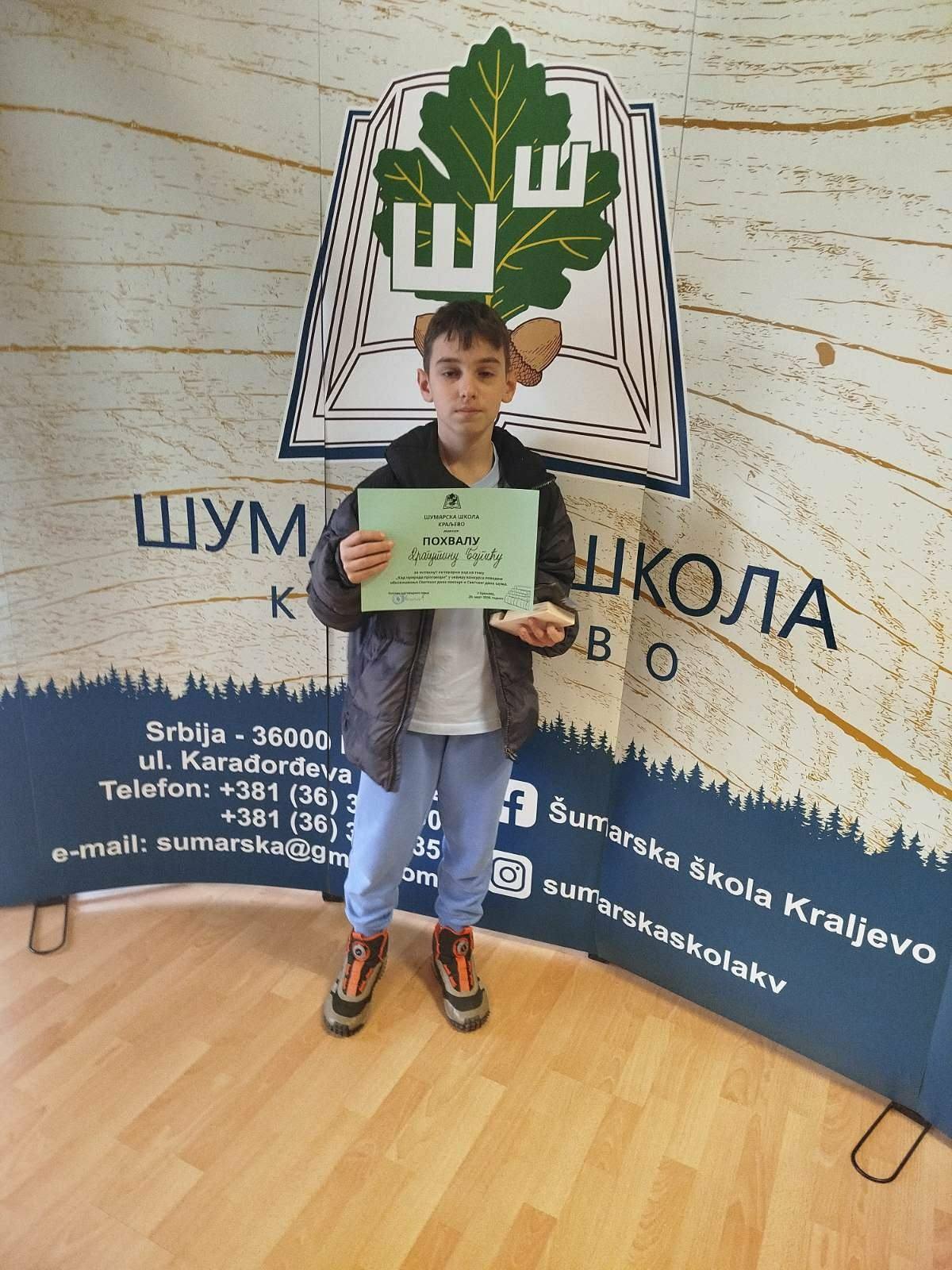 ПОХВАЛА ЗА ДРАГУТИНА БАЈАГИЋА, учесника литерарног конкурса, који је расписала Шумарска школа поводом Светског дана поезије и Светског дана шума. Свечана додела похвалница уприличена је данас, у 13:00 часова у амфитеатру школе. Драгутин је још једном показао своје литерарне способности, моћ писменог изражавања и културу неговања лепе речи на тему Кад природа проговори. Награђен је за креативност, труд и оригиналан однос према природи. У пратњи психолога Милене Остраћанин, Драгутин је присуствовао пригодном музичко-поетском програму. Честитамо Драгутину са жељом да настави путем литерарног стваралаштва! Гордана Денић, ментор