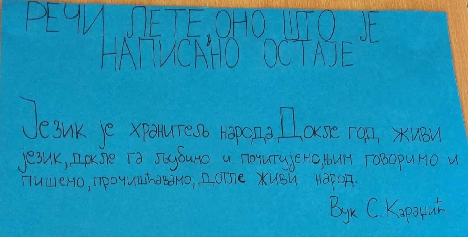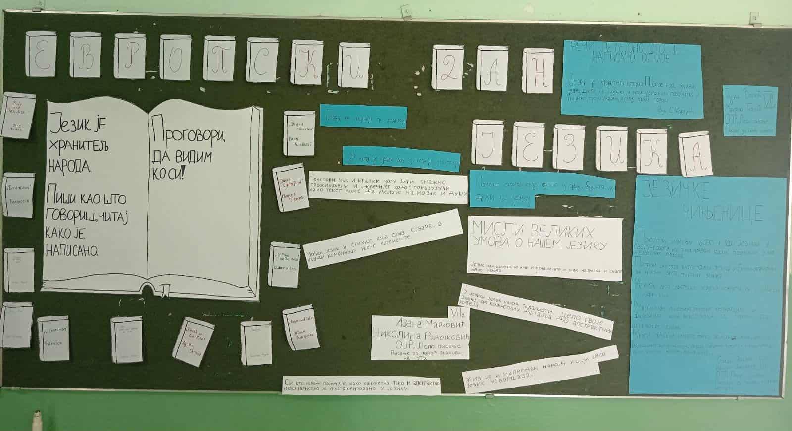 Поводом обележавања Европског дана језика реализоване су различите активности у нашој школи. Циљ тих активности јесте сарадња ученика, упознавање са европском породицом језика чији је саставни део и наш језик. Тим поводом исписали смо по коју реч, реченицу, цитат, мудру мисао. Ученице 7/1, Сташа Вранић и Невена Јовановић, направиле су. паное под називом ,,Језичке чињенице" и ,,Речи лете, оно што је написано остаје." Ученице 7/2, Ивана Марковић и Николина Радојковић, ауторке су паноа под називом ,, Мудре мисли великих умова о нашем језику," а у оквиру пројекта ,,Обогаћен једносменски рад", активност ,,Лепо писање. Писање уз помоћ знакова на путу." Радови су изложени у холу школе. Гордана Денић, наставник српског језика и књижевности