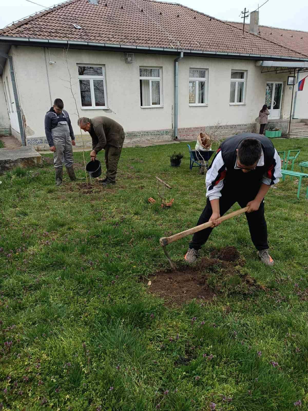 За зеленије и лепше двориште-поклон саднице од Шумарске школе у Краљеву У недељи када се обележава Светски дан шума , ученици осмог разреда учествовали су у уређењу школског дворишта. Саднице мечје леске и црног бора, које смо добили као поклон од Шумарске школе посађене су у дворишту матичне школе , пратећи инструкције професора ове школе. Захваљујемо се на поклону и одличној сарадњи, коју имамо са Шумарском школом