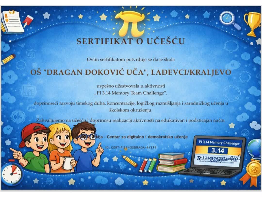 СЕРТИФИКАТ О УЧЕШЋУ У АКТИВНОСТИ-DIGIDEMДатум: 22. Mart 2026 08:41 Категорија: Новости![]() ![]() |